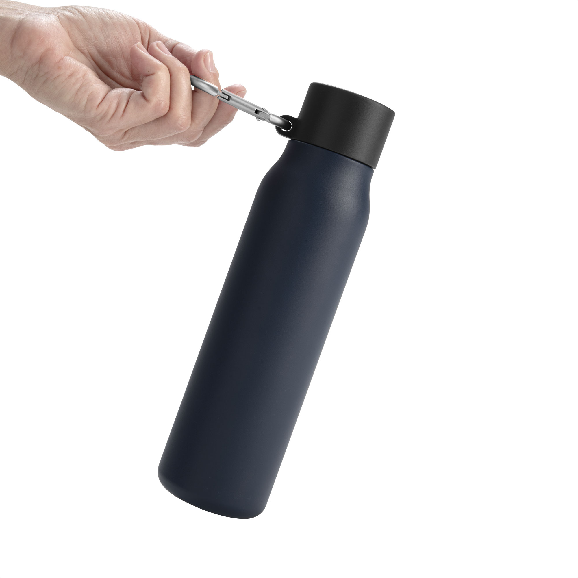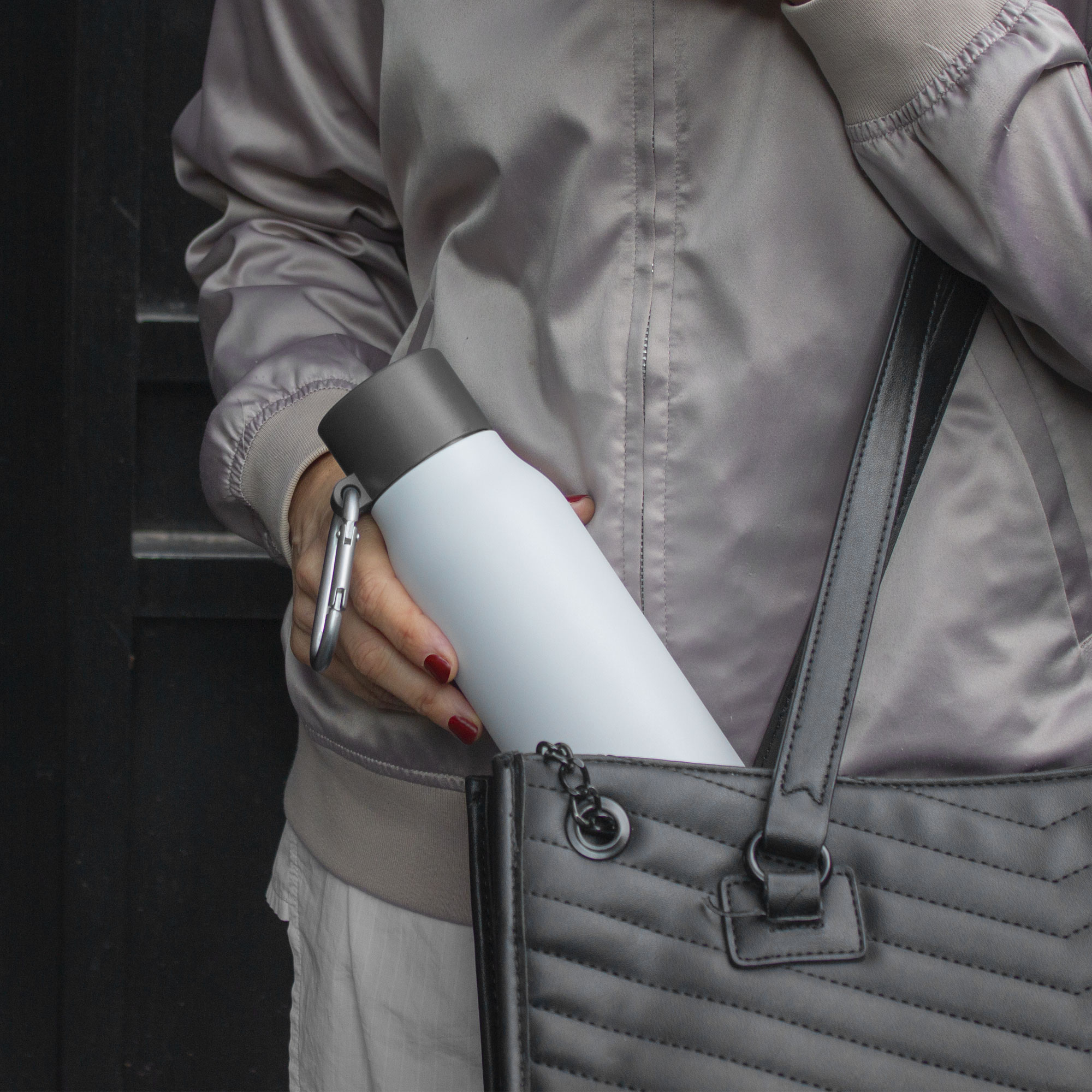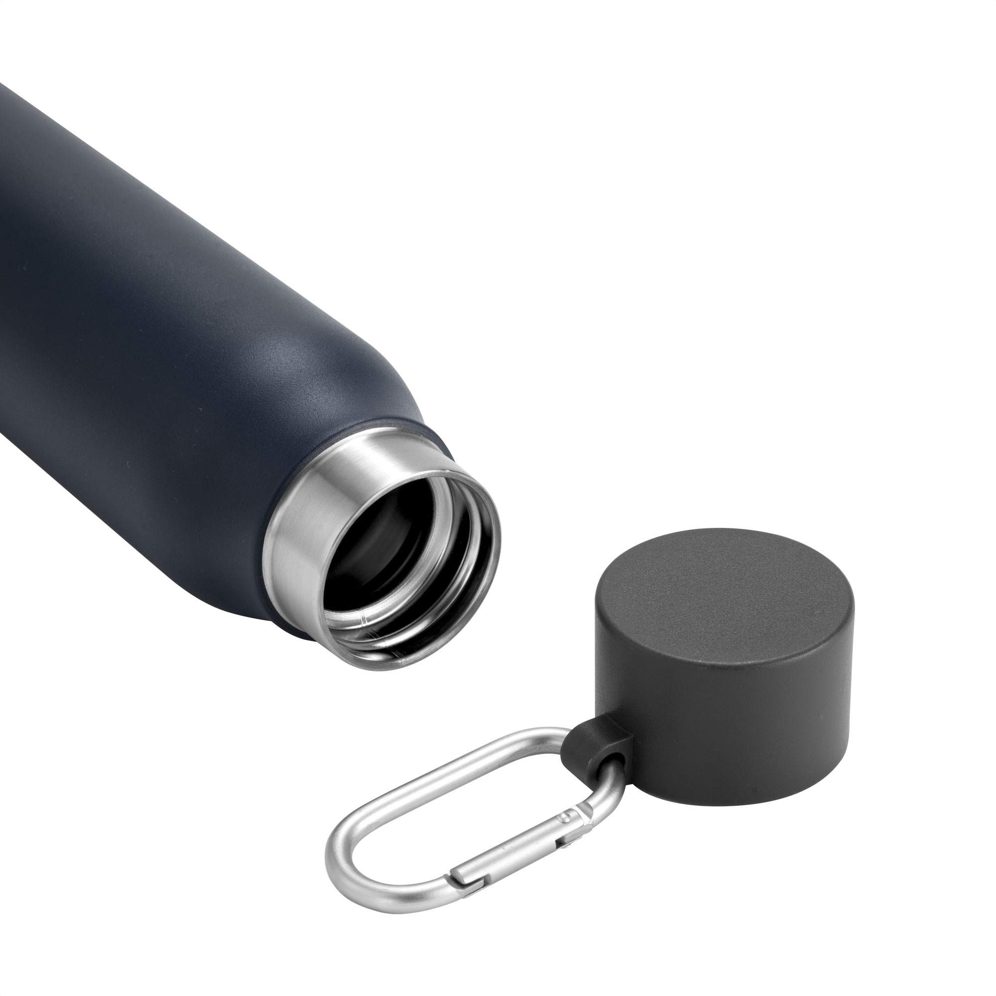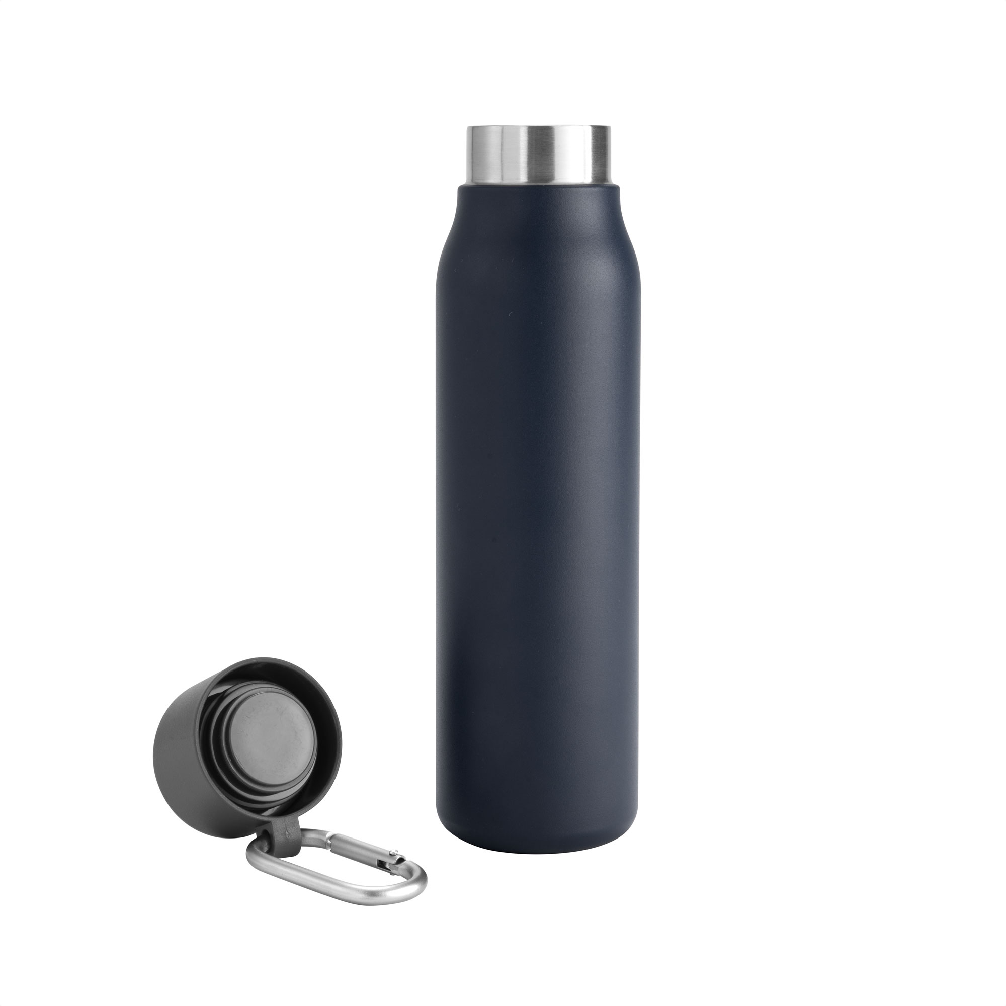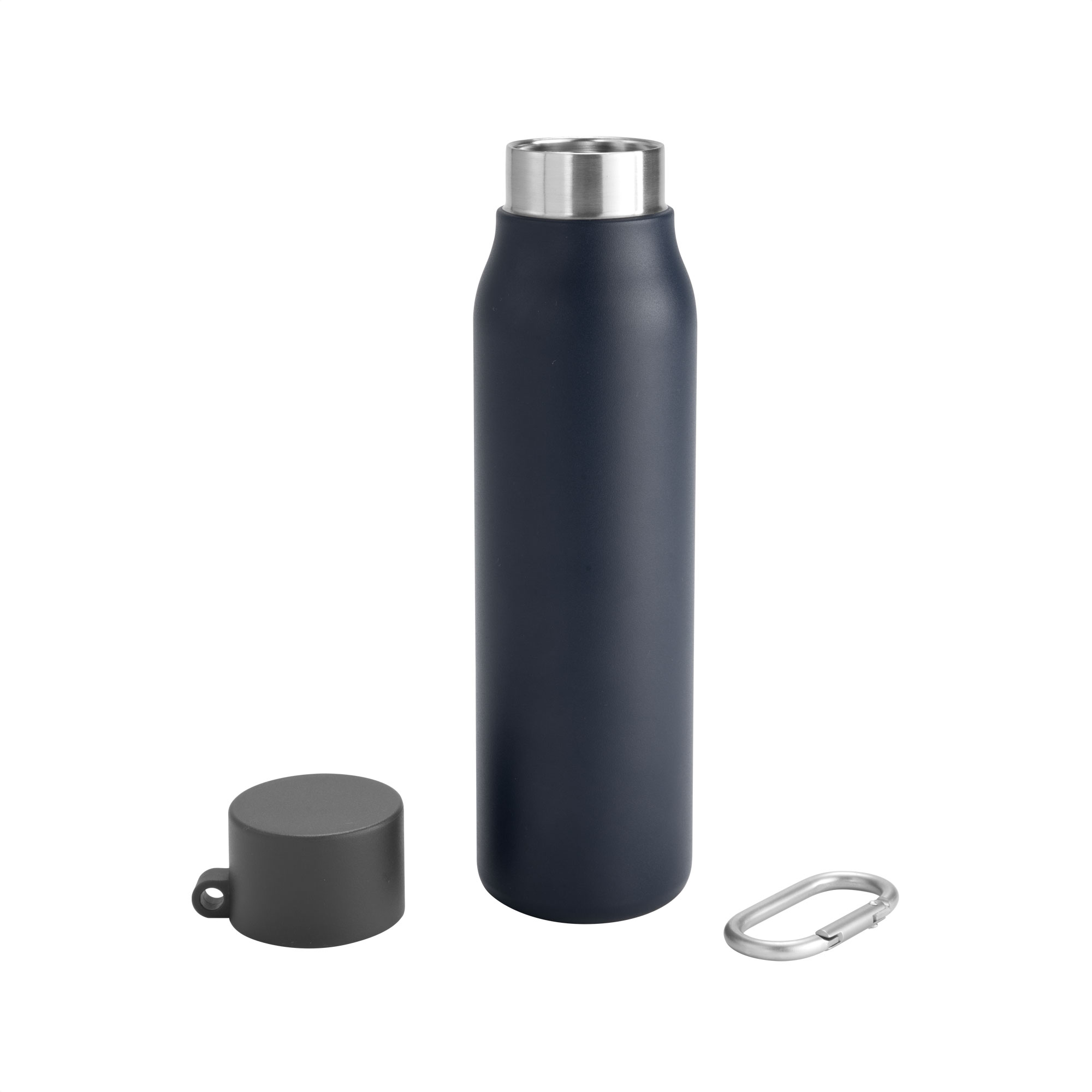Botella doble pared, sellada al vacío. Interior en acero 304 reciclado y exterior en acero 201. Pintura powder coat (pintura más duradera y resistente a la corrosión y el paso del tiempo). Tapa plástica de polipropileno y anillo de silicona con mosquetón de aluminio. Mantiene hasta 12 hs la temperatura de las bebidas calientes y 24 hs de las bebidas frías.
