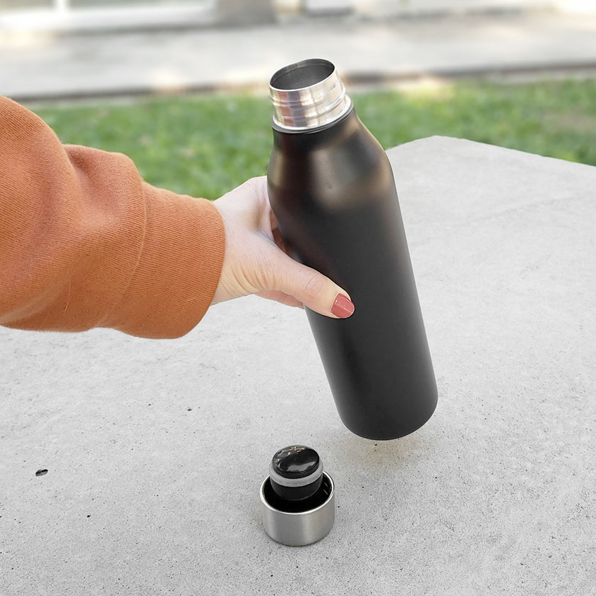 Ø 6,6 x 24,5 cm. Capacidad 500 ml. Acero inoxidable. Botella doble pared, sellada al vacío con recubrimiento de cobre. Interior de acero 304 y exterior de acero 201. Pintura color negro mate. Tapa de acero a rosca. Mantiene por más de 12 hs la temperatura de las bebidas calientes y 24 hs de las bebidas frías. Presentación en caja de regalo.