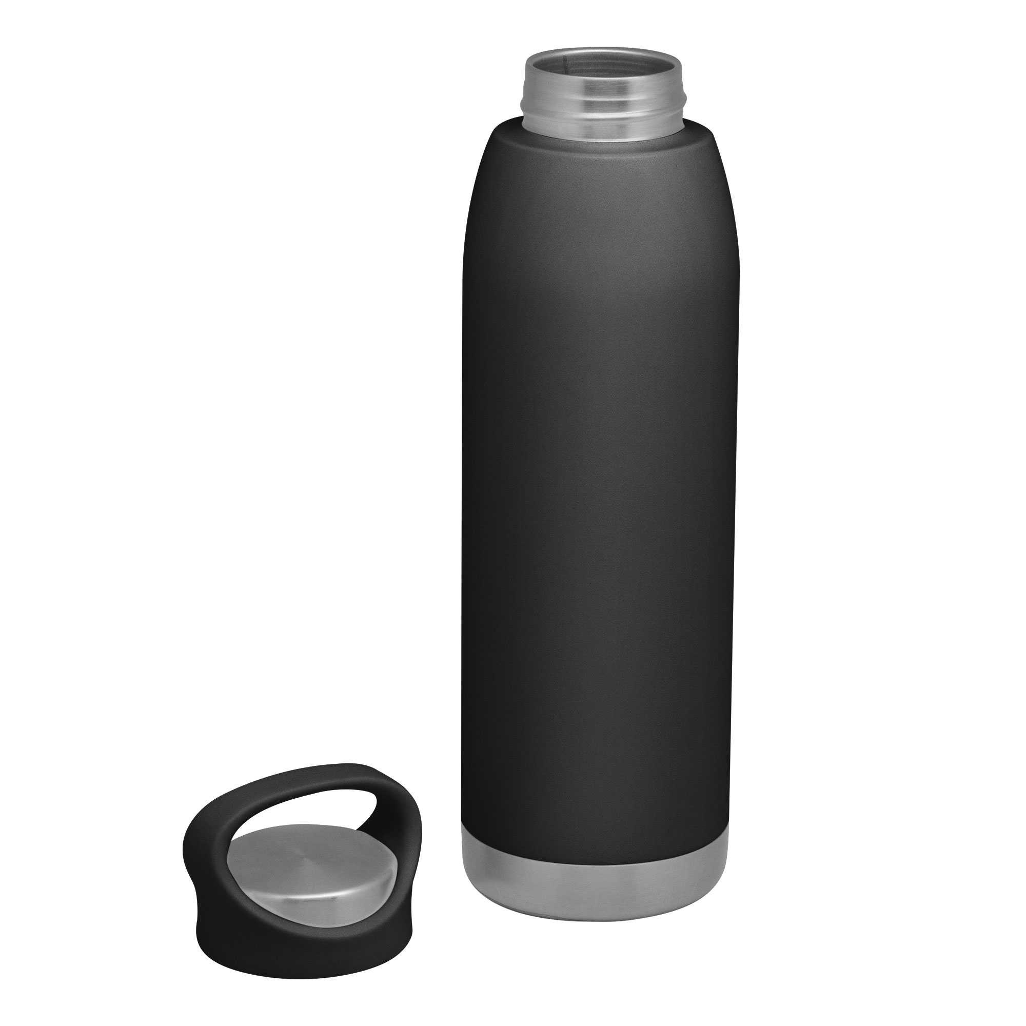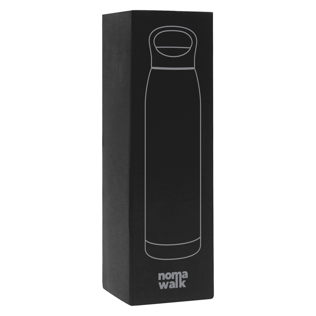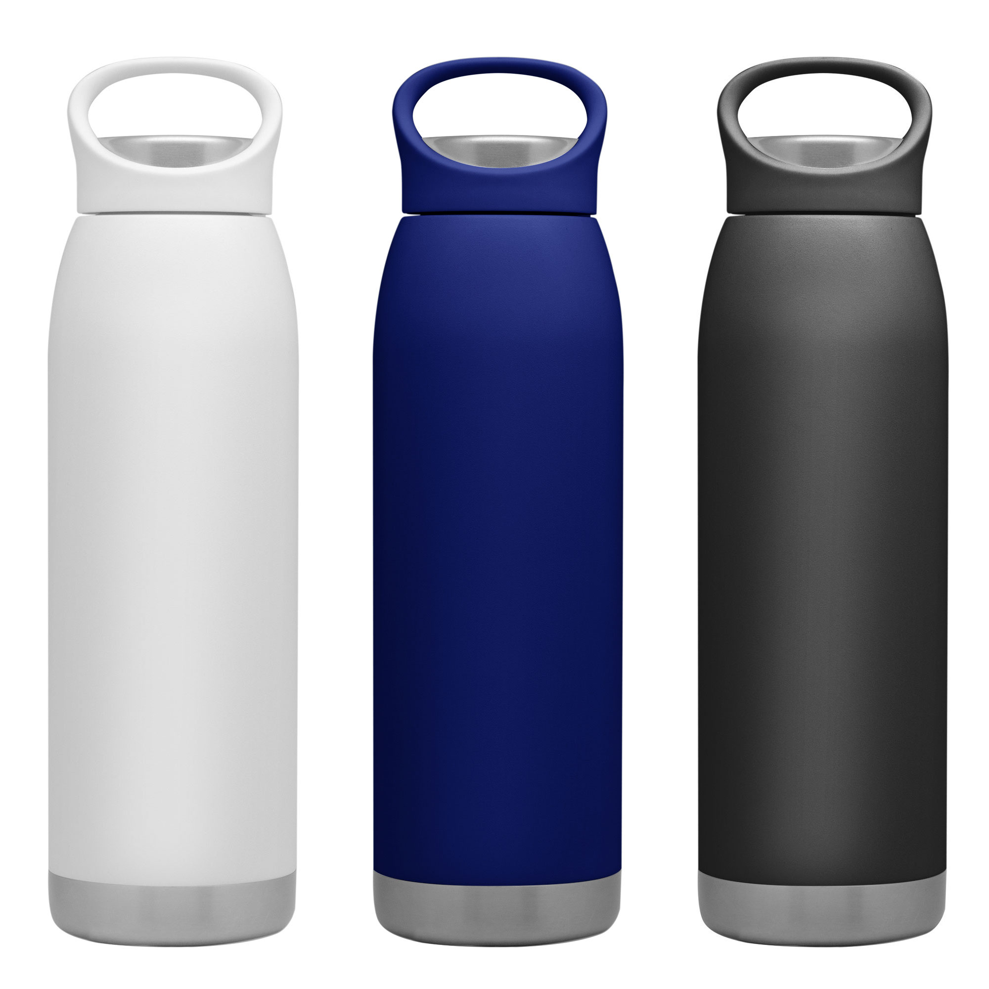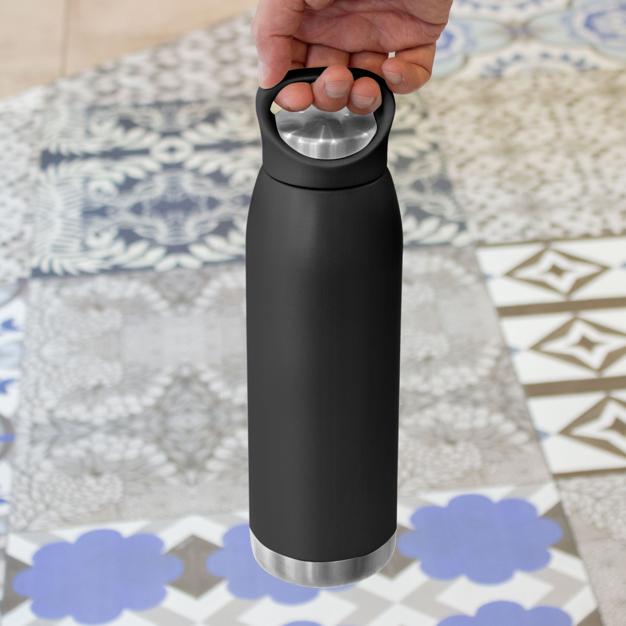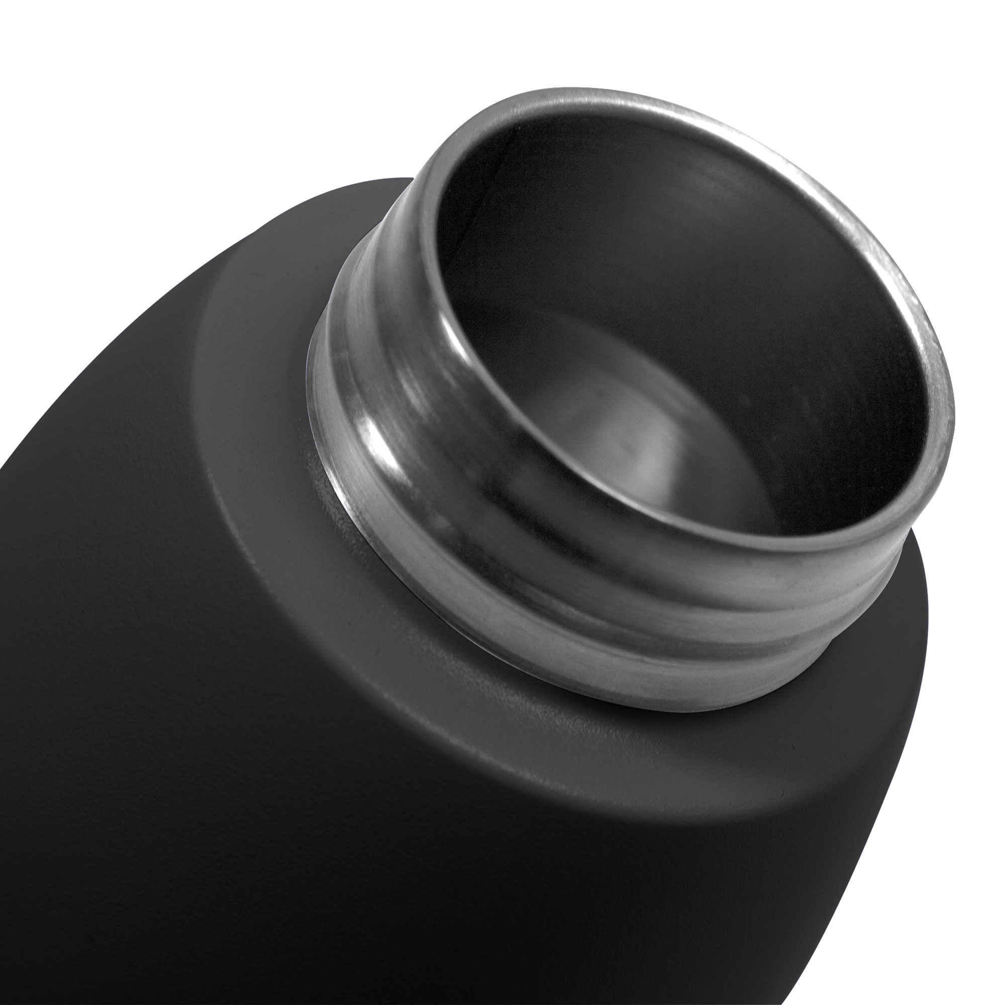 Ø 7,6 x 26,5 cm. Capacidad 600 ml. Acero inoxidable. Botella doble pared, sellada al vacío. Interior en acero 304 y exterior en acero 201. Pintura en colores mate. Tapa combinada en plástico del mismo color de la botella y acero inoxidable 201. Mantiene hasta 12 hs la temperatura de las bebidas calientes y 24 hs de las bebidas frías. Presentación en caja de regalo.