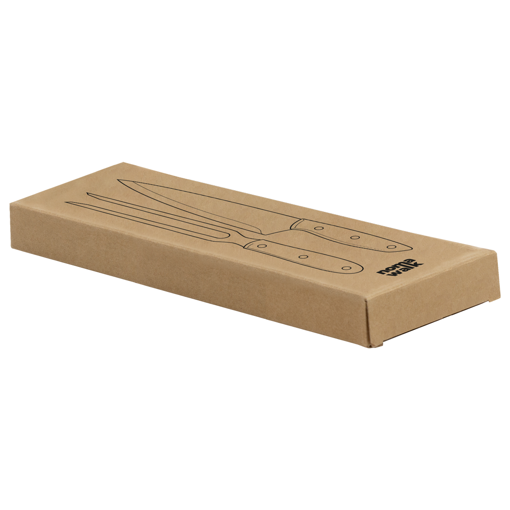 34 x 9,7 x 2,5 cm (caja). Acero inoxidable 420. Set de 2 utensilios: tenedor y cuchillo de 31,4 cm. ambos con mango de madera. Presentación en caja de regalo Kraft.