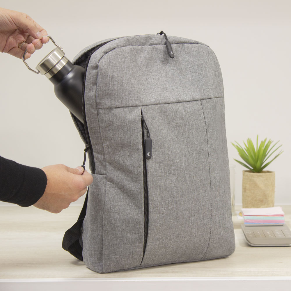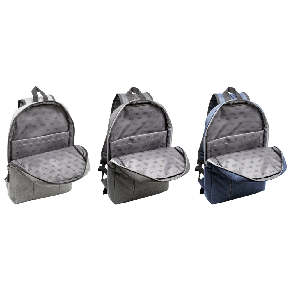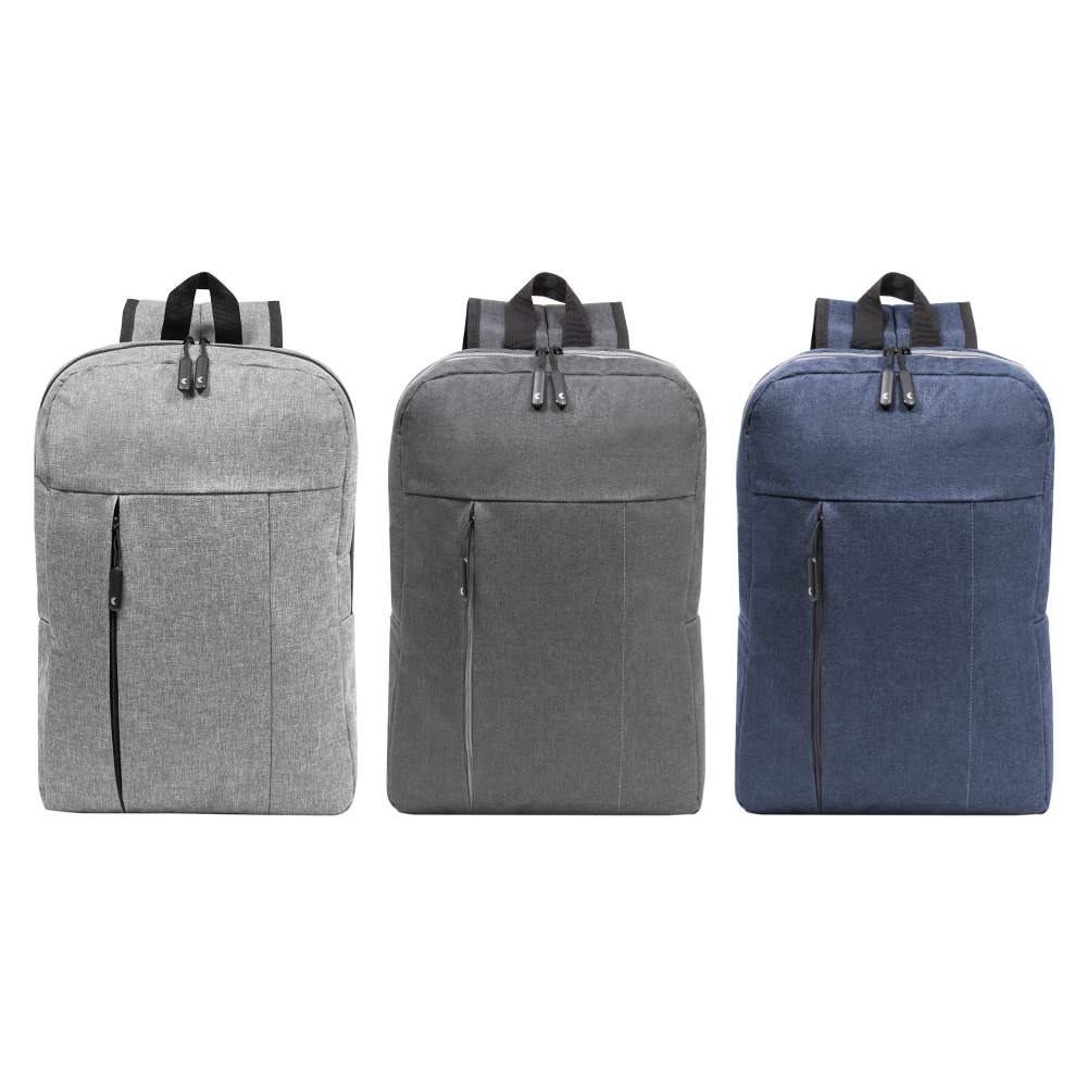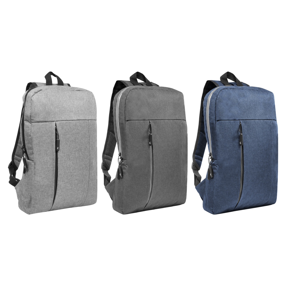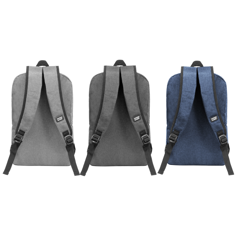 30 x 44 x 8 cm. Capacidad 11 litros. Poliéster 300D . Mochila Portanotebook. Compartimento principal con cierre y bolsillo frontal con cierre lateral y detalle de costura vertical. En el interior posee un compartimento acolchado para notebook y un bolsillo adicional para tablet. Tiradores de cierre engomados. Presencia de marca en su interior y en una de sus correas.